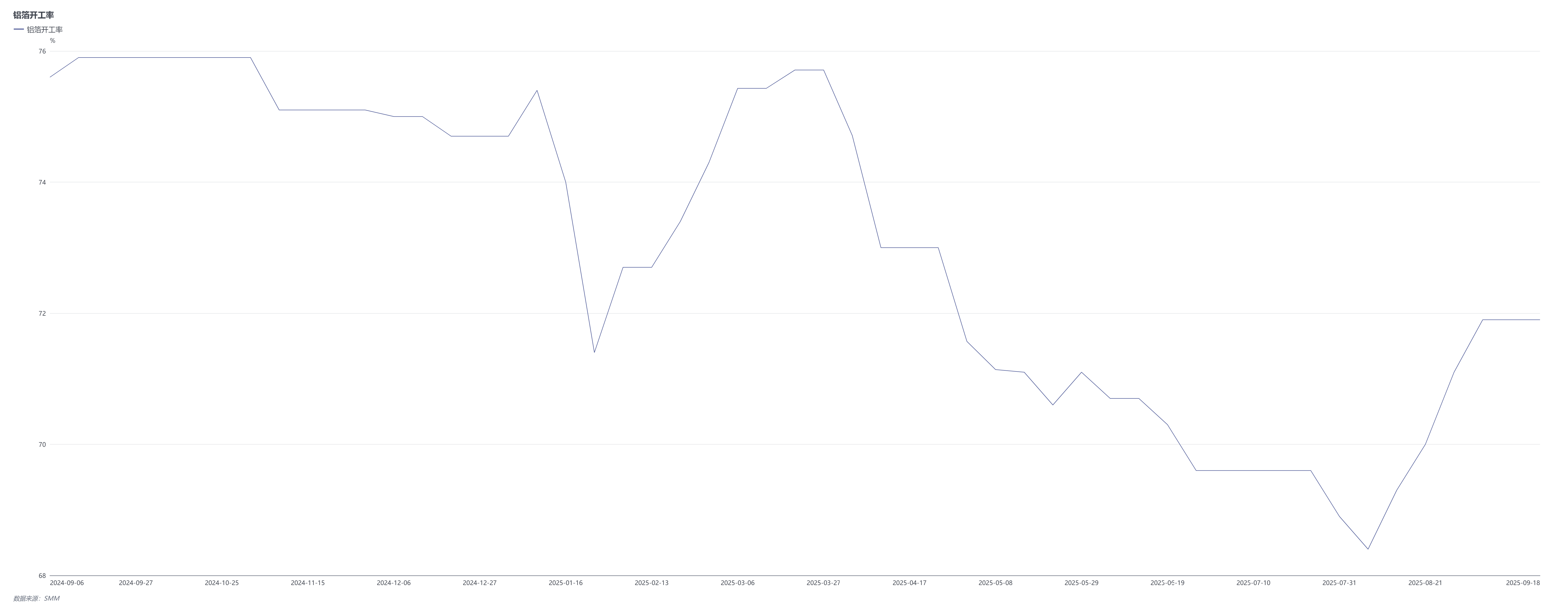 而回到当下的铝箔市场,据上周SMM了解,上周国内铝箔龙头企业开工率继续录得71.9%,维持在相对高位。尽管头部企业保持高负荷运转,但增速放缓的态势已清晰显现,包装箔作为主力产品,需求端保持刚性但未现季节性爆发,其非周期性特征在当前市场环境中表现得尤为明显。新能源领域的电池箔维持良好表现,产量有望冲击55万吨年度目标,钎焊材料排产同比无明显增长,进一步印证了下游制造业复苏力度的不均衡。展望后市,SMM预计,短期内在旺季效应支撑下,铝箔龙头企业开工率预计将维持72-75%的震荡上行通道。
