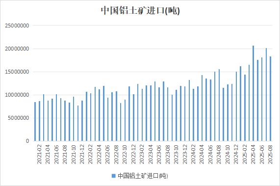 海关总署在线查询数据显示,中国2025年8月铝土矿(铝矿砂及其精矿)进口量为1829万吨,环比下降8.8%,同比上涨17.6%。其中几内亚仍是最大供应国,但当月输送量环比下降22.7%至1233万吨,其他国家输送量多有不同程度的增加。此前几内亚Axis矿区大规模停工且雨季逐渐影响矿山开工,因此本月几内亚铝土矿输送出现下滑。