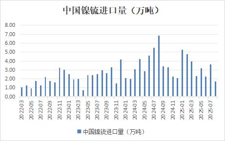 据中国海关数据统计,2025年8月中国镍锍进口量1.69万吨,环比减少1.92万吨,降幅53.18%;同比减少5.14万吨,降幅75.27%,降至2023年12月以来新低。