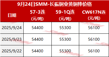 【SMM价格】2025年9月24日长振黄铜棒价格