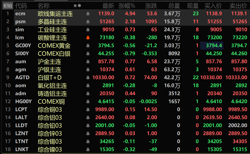 此外,铸造铝主连期货跌0.28%,氧化铝主连涨0.44%。碳酸锂主连跌0.38%,工业硅主连涨0.73%。多晶硅主连涨2.18%。