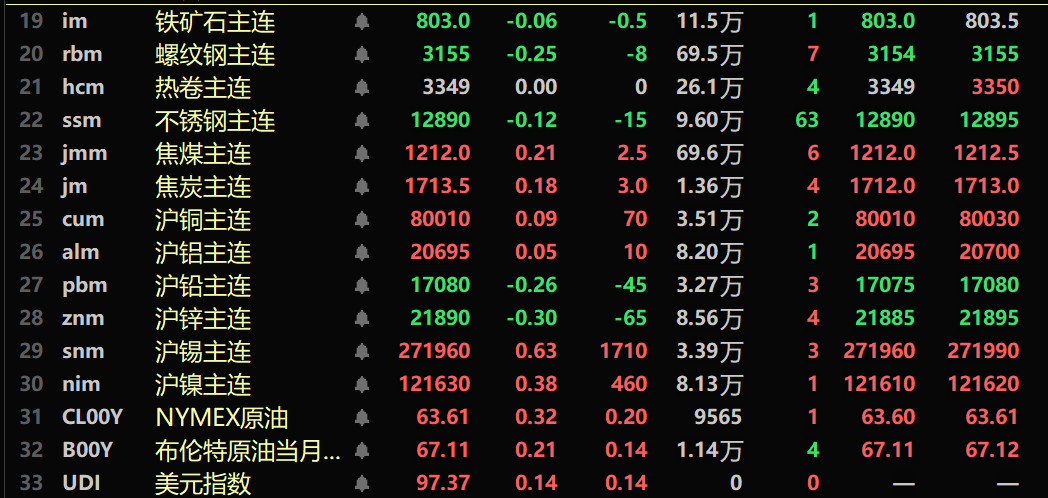 黑色系多飘绿,铁矿微跌0.06%,螺纹跌0.25%,热卷平于3349元/吨,不锈钢跌0.12%。双焦方面:焦煤主力合约涨0.21%,焦炭主力合约涨0.18%。