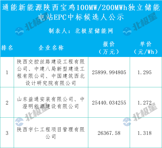 北极星储能网获悉,9月24日,通能新能源100MW/200MWh独立储能电站项目工程总承包(EPC)中标候选人公示。