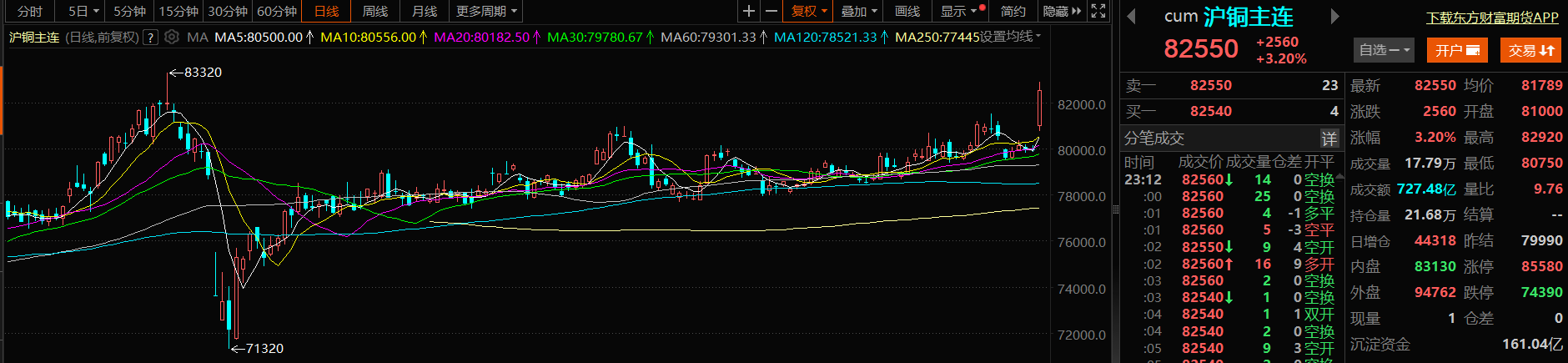 沪铜夜盘大涨,触及自2025年3月26日以来的新高,追随伦铜升势。