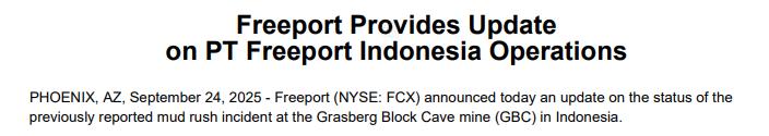 9月24日(周三),自由港(Freeport)今日就先前报告的印尼Grasberg Block Cave矿(GBC)泥石流事件状况提供最新信息。