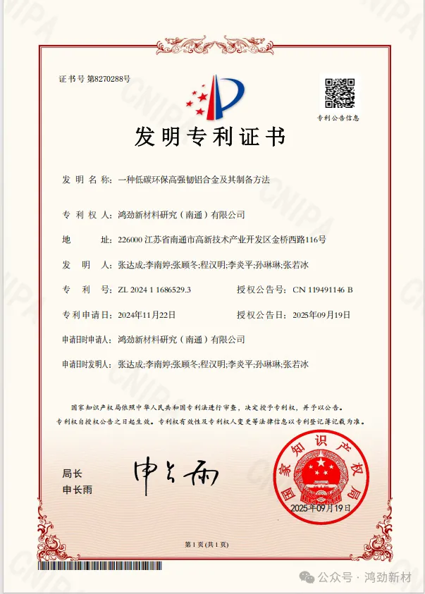 在全球经济逐步向低碳、环保转型的背景下,工业领域的科技创新成为关注的重点。鸿劲新材旗下南通新材料研究院成功获得发明专利授权证书(专利号:ZL20241 1686529.3),这一创新不仅回应了当前对绿色发展与可持续生产的迫切需求,也展现出鸿劲新材在新材料研发上的卓越实力。