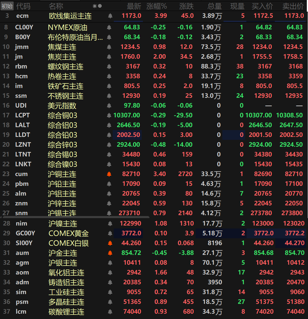 此外,碳酸锂主连涨0.93%,多晶硅主连涨0.89%,工业硅主连涨0.72%。欧线集运主连涨3.99%报1173.。