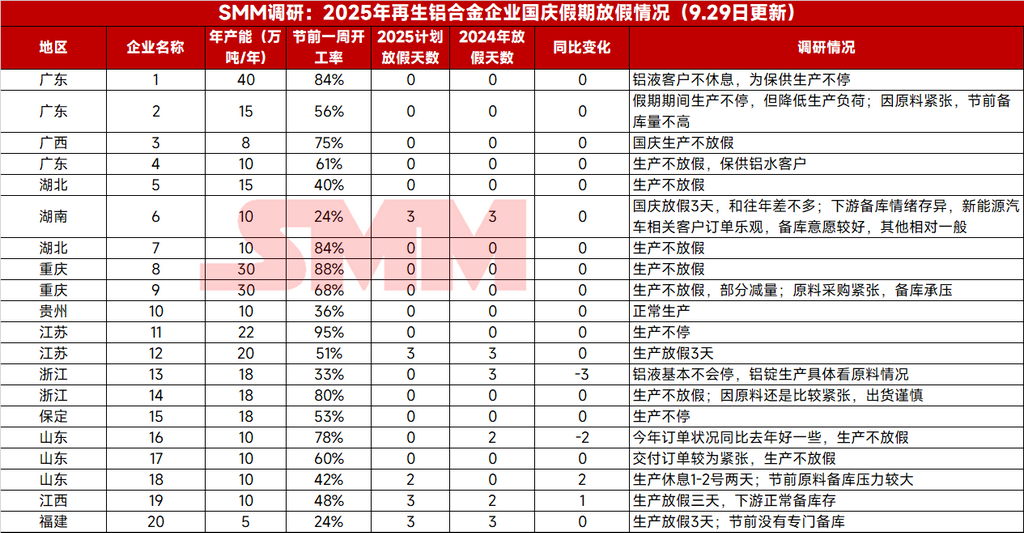 国庆假期将至,再生铝合金企业已基本完成假期生产与放假安排。SMM对部分再生铝企业的假期开工情况进行了调研汇总,本次调研共涉及20家企业,合计年产能达319万吨。以下为部分企业的具体放假安排及备库情况: