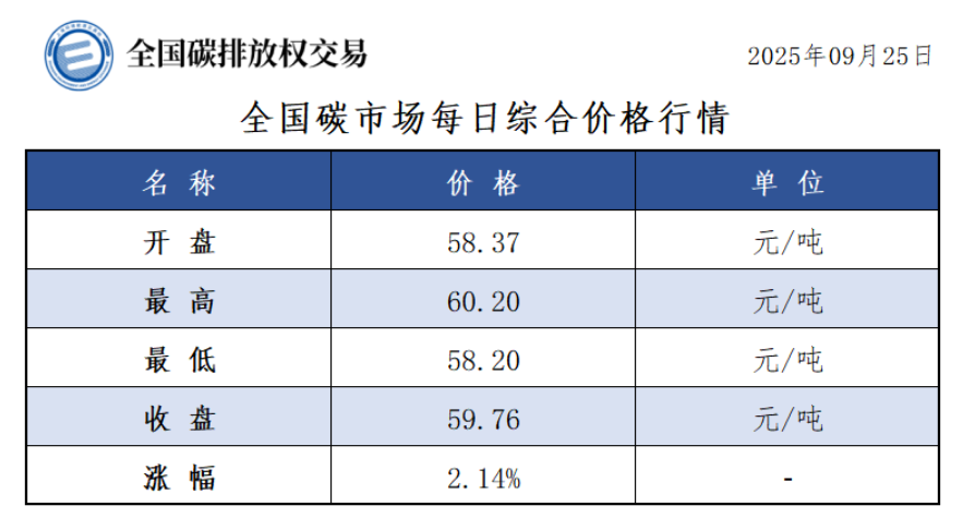 今日全国碳市场综合价格行情为: 开盘价58.37元/吨,最高价60.20元/吨,最低价58.20元/吨,收盘价59.76元/吨,收盘价较前一日上涨2.14%。