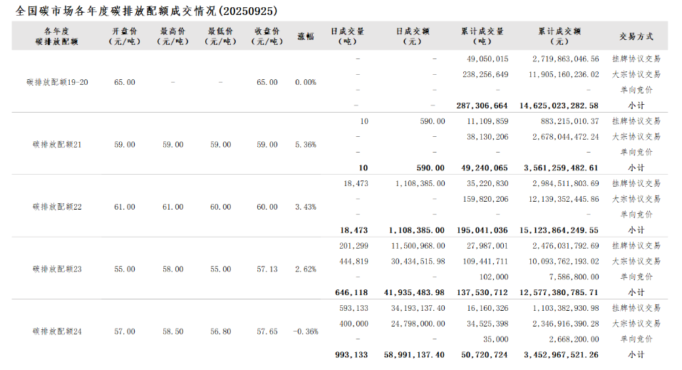 2025年1月1日至9月25日,全国碳市场碳排放配额成交量89,570,537吨,成交额6,307,768,218.20元。