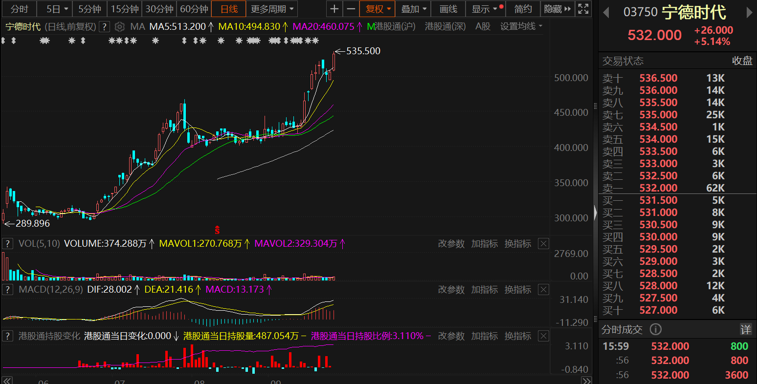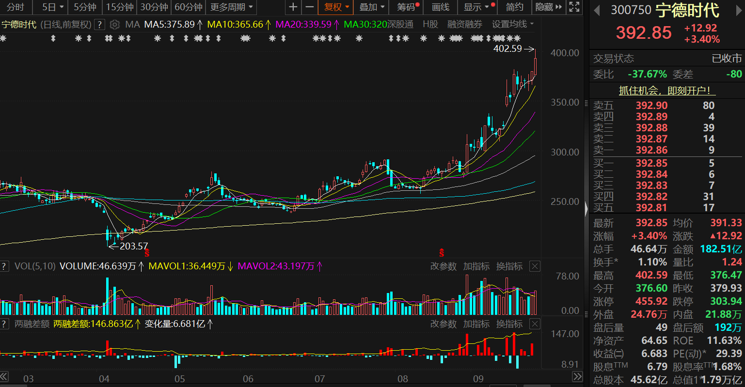 SMM 9月25日讯:9月25日,宁德时代AH股价一同震荡上涨,其A股临近午间收盘时盘中最高涨幅一度逼近6%,盘中最高触及402.59元/股,股价续刷历史新高,H股股价盘中涨逾5%,最高触及535港元/股,AH股总市值突破1.84万亿元,超越贵州茅台1.80万亿元的总市值。