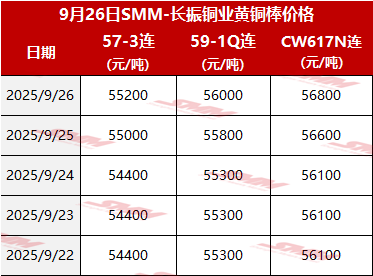 【SMM价格】2025年9月26日长振黄铜棒价格