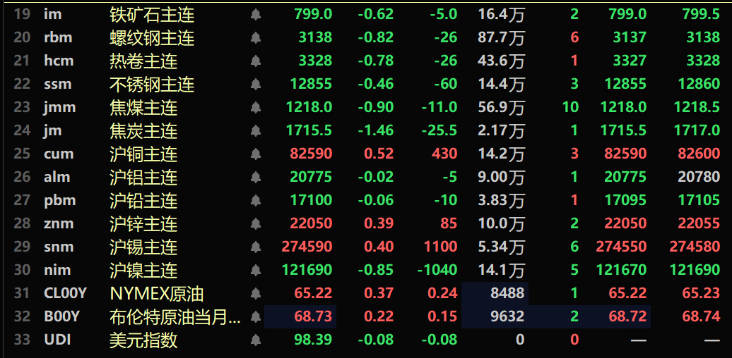 黑色系均飘绿,铁矿跌0.62%,螺纹跌0.82%,热卷跌0.78%,不锈钢跌0.46%。双焦方面:焦煤主力合约跌0.9%,焦炭主力合约跌1.46%。