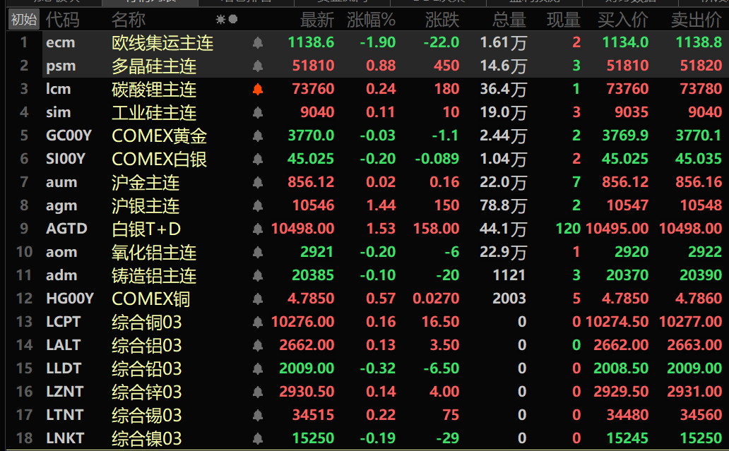 此外,铸造铝主连期货跌0.1%,氧化铝主连跌0.2%。碳酸锂主连涨0.24%,工业硅主连涨0.11%。多晶硅主连涨0.88%。
