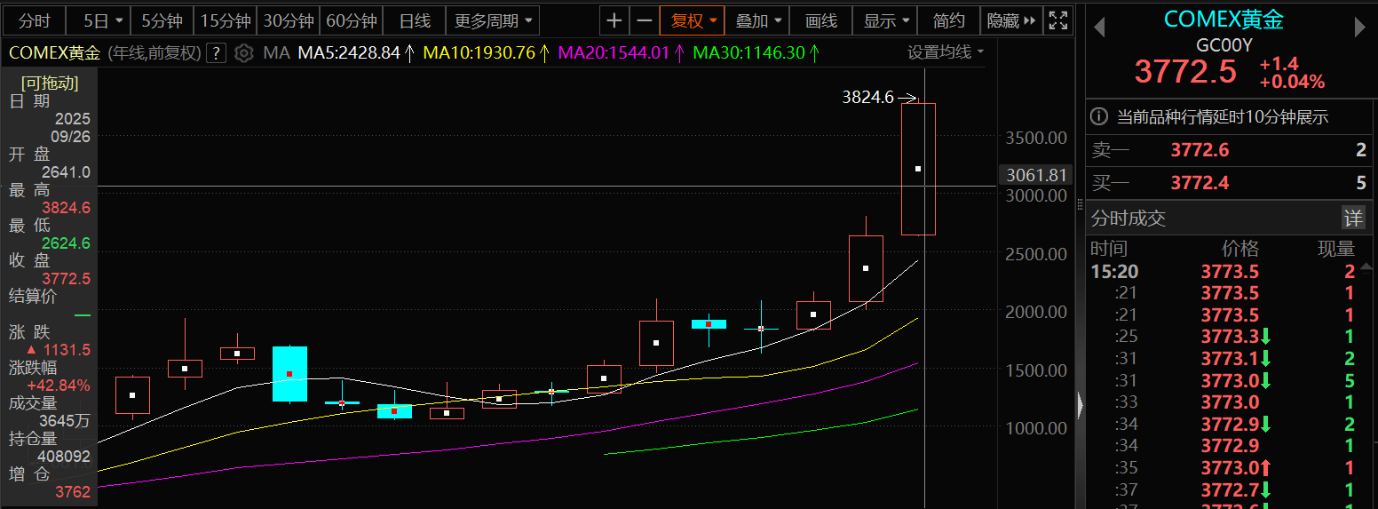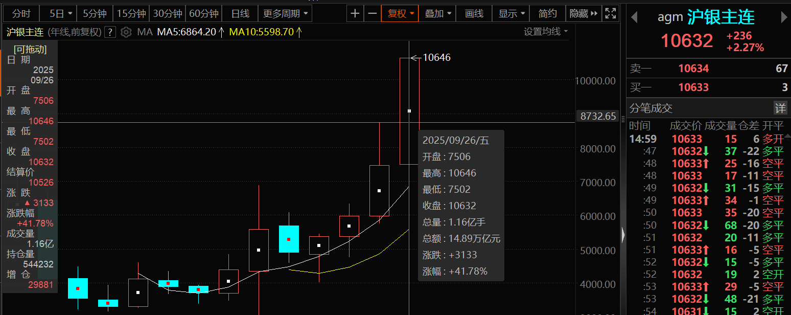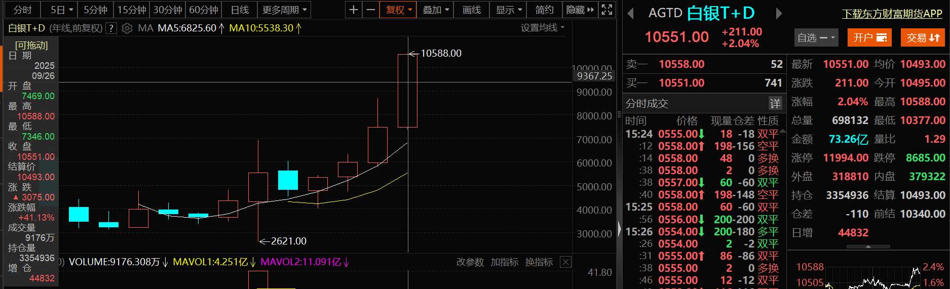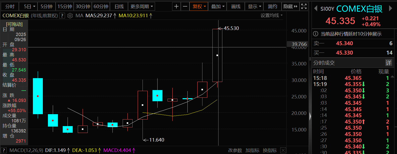 特朗普关税政策带来的贸易不确定性、美国政府关门危机反复出现以及地缘冲突持续使得全球市场对贵金属等避险资产的需求提升;美联储9月落地年内首次25 个基点降息后,市场对后续宽松周期的预期持续升温,支撑贵金属价格走强;光伏银浆耗银等白银工业需求的增长支撑银价走强;此外,部分投机与套保资金集中进场也推升了银价,截至9月26日15:30分,COMEX黄金涨0.04%,其今年的年线涨幅暂时为42.84%;沪金主连涨0.01%,其今年的年线涨幅暂时为38.82%;COMEX白银涨0.49%,盘中刷新历史新高至45.53美元/盎司,其今年的年线涨幅暂时为55.03%;沪银主连涨2.27%,盘中刷新历史新高至10646元/千克,其今年的年线涨幅暂时为41.78%;白银T+D涨2.04%,盘中刷新上市以来的历史新高至10588元/千克,其今年的年线涨幅暂时为41.13%。在贵金属频繁刷新历史新高并积累了可观的涨幅之后,市场提示风险的声音逐渐增多。
