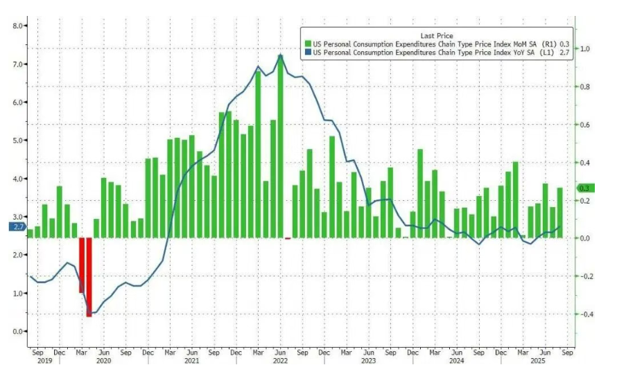 具体数据显示,美国8月核心PCE物价指数同比增长2.9%,与前值一致;环比增长0.2%,前值增长0.3%。整体PCE物价指数环比上涨0.3%,同比涨幅升至2.7%,前值为2.6%。