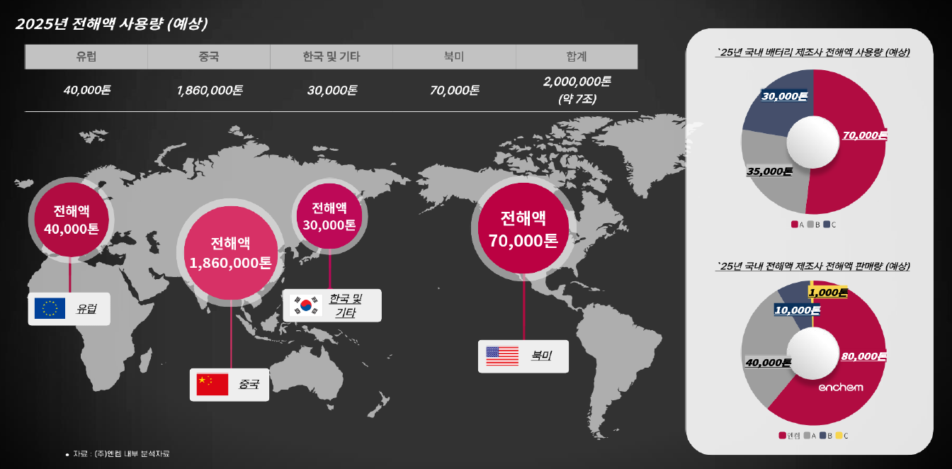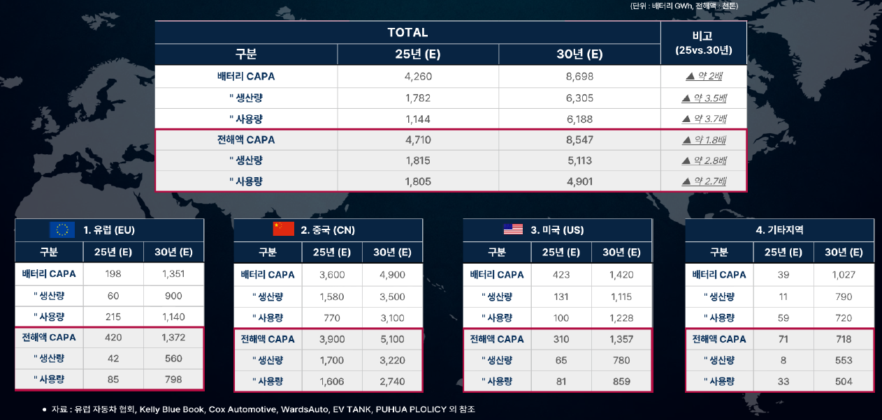 2025年至2030年全球各洲电池与电解液的产能及使用量预测(E)