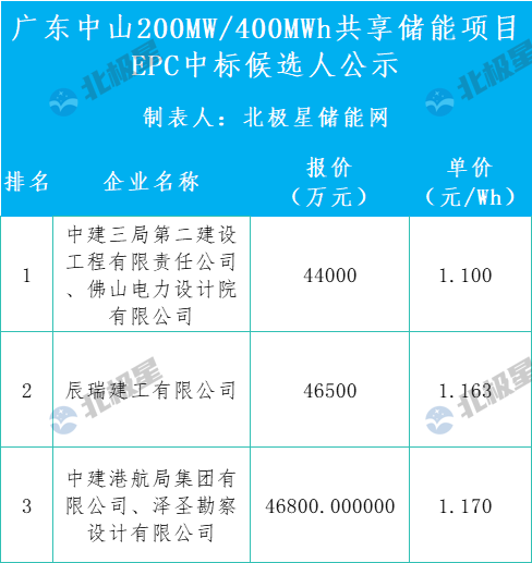 第一中标候选人:中建三局第二建设工程有限责任公司、佛山电力设计院有限公司联合体,投标报价44000万元,折合单价1.1元/Wh;