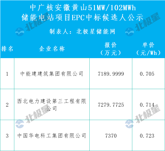 北极星储能网获悉,9月26日,中广核黄山市高新区51MW102MWh储能电站项目EPC总承包工程中标候选人公示。