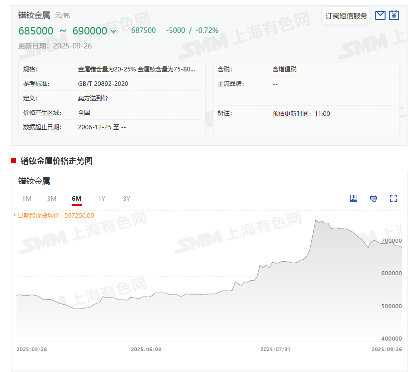 9月26日,镨钕金属的价格为685000-690000元/吨,其均价为687500元/吨,较其前一交易日下跌0.72%。687500元/吨这一均价与其去年2024年12月31日的均价489000元/吨相比,上涨了198500元/吨,今年以来的涨幅为40.59%。不过,经历了七八月份整体处于明显上升态势之后,镨钕金属近来出现了回调。近日磁材大厂对镨钕金属的招标价格低于预期,反映出下游对于高价镨钕金属的需求支撑不足,这导致了镨钕金属价格出现小幅下降。不过,随着磁材大厂招标采购活动增多,预计镨钕金属价格进一步下跌的空间有限。
