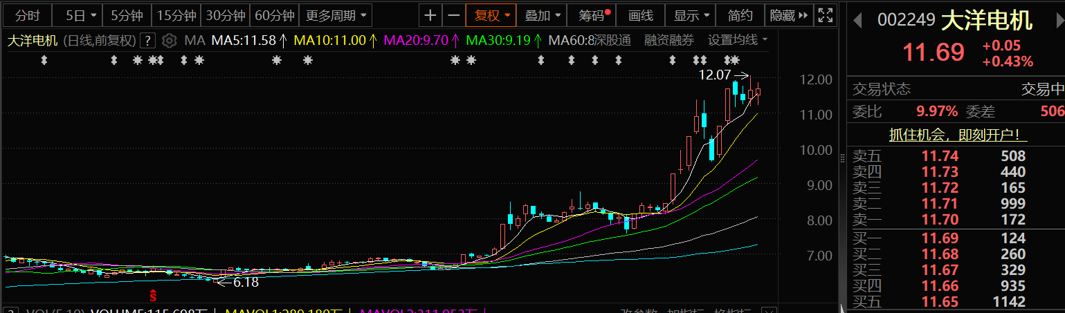 9月29日,大洋电机的股价出现上涨,截至29日10:15分,大洋电机涨0.43%,报11.69元/股。