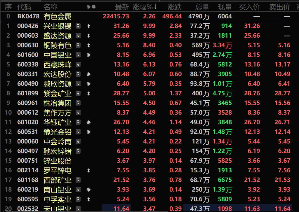 9月29日,有色金属板块走强,截至29日收盘,有色金属板块涨2.26%,个股方面,盛达资源、兴业银锡涨停,铜陵有色、中国铝业、西藏珠峰以及紫金矿业等涨幅居前。消息面上:工信部等八部门9月28日联合印发《有色金属行业稳增长工作方案(2025—2026年)》,明确行业增加值年均增长5%、再生金属产量突破2000万吨的目标,还配套超长期特别国债等资金支持,这一方案为有色金属行业的发展提供了有力的政策支撑;印尼 Grasberg 铜矿事故发酵,将对四季度及 2026 年供应产生较大影响,市场对铜供应链脆弱的敏感神经被牵动,市场对供应趋紧的情绪升温。虽然高价抑制了部分备货需求,但旺季消费韧性仍存,且市场预期四季度国内消费刺激政策持续发力,新能源汽车、电力等领域需求有望持续保持,也将使得市场对有色金属的需求保持着比较旺盛的态势;近期贵金属价格迭创新高,带动拥有金银等副产品的有色金属企业业绩预期改善,间接提升相关企业的市场关注度;此外,部分市场资金对有色金属板块的青睐等也带动了有色金属板块的走强。