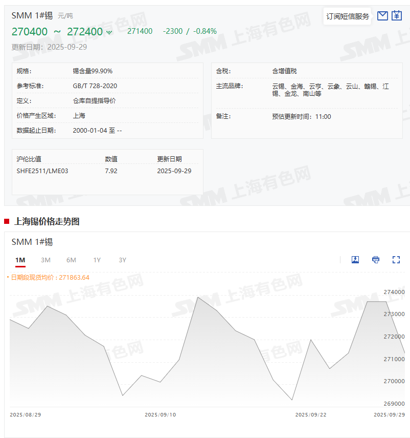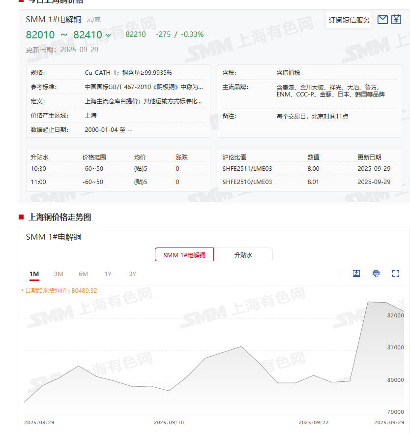 铜现货方面:9月29日,SMM1#电解铜价格为82010~82410元/吨,较前一交易日下跌275元/吨,跌幅为0.33%。基本面方面,供应端进口铜与国产非注册货源供应相对宽松,使市场现货供应整体维持较为宽松状态。需求端高铜价抑制下游备货情绪导致需求表现疲软。综合来看,预计今日铜价下方存在支撑但上方空间有限。