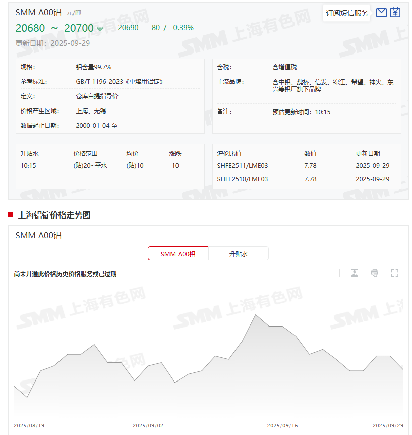 铝现货市场方面:SMMA00铝现货9月29日的均价为20690元/吨,较前一交易日跌0.39%。基本面:库存方面,据SMM统计,9月29日电解铝锭地区社会库存录得59.2万吨,较上周四去库2.5万吨,较上周一去库4.6万吨。供应端,近期电解铝产量相对稳定,维持在84.73万吨/周;成本方面,国内电解铝完全成本为 16,283元/吨,周环比下降81元/吨,行业平均利润扩大71元/吨至4,487元/吨附近。双节小长假即将来临,据悉,个别华南地区铝型材企业放假天数在6-7天及以上,较往年更长,但总体来看与往年相差不大;铝线缆板块头部企业订单相对集中,预计无放假安排,与往年情况类似;铝板带箔头部企业同样基本无放假安排,但双节假期期间开工排产预计放缓。目前根据历史同期数据及SMM与市场交流情况综合判断,国庆假期暂时预计累库总量在6-8万吨左右,具体累库幅度情况需视在途量接铝厂节前发运情况而定。 综合来看,宏观方面,美联储内部就未来货币政策路径分歧加大,增加了后续市场不确定性;国内方面,铜冶炼“反内卷”情绪带动铝期货走强。基本面上,双节前备货临近尾声,后续接货量预计减少,双节期间铝锭库存预计累库6-8万吨,叠加9月去库不及预期,节后初期电解铝升水预计面临一定压力,基本面看铝价上方20,900-21,000元/吨仍然承压;进入到10月,北方部分企业反馈铝水比例预期提高,铸锭量预计维持低位,给予铝价支撑。后续需关注双节前后铝锭库存变动情况,另外需注意,反内卷相关政策,不排除带动铝价,超出基本面上涨的风险。