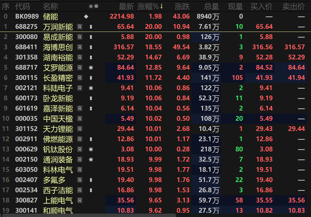 不仅如此,储能板块今日表现也十分活跃,易成新能盘中20CM涨停,另外,卧龙新能、佛燃能源、嘉泽新能等近9股盘中封死涨停板。
