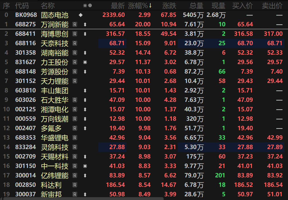 固态电池板块盘中也一同拉涨,指数一度涨逾2%。个股方面更是掀起了小规模涨停潮,丰山集团、石大胜华、湘潭电化、万向钱潮、多氟多等超5股涨停,天赐材料、华正新材等多股纷纷跟涨。