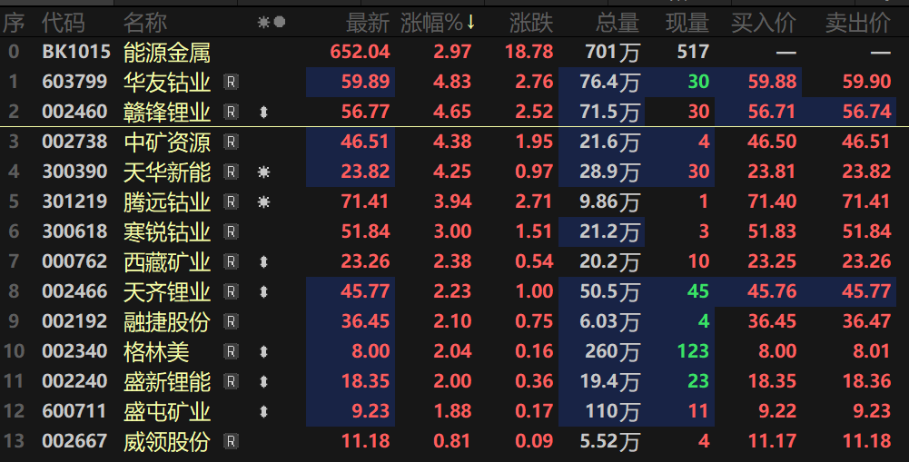 此外,能源金属板块今日也一同攀升,指数盘中一度涨逾4%。个股方面,赣锋锂业、华友钴业、天花新能、腾远钴业等多股涨逾5%,中矿资源、寒锐钴业、格林美等纷纷跟涨。