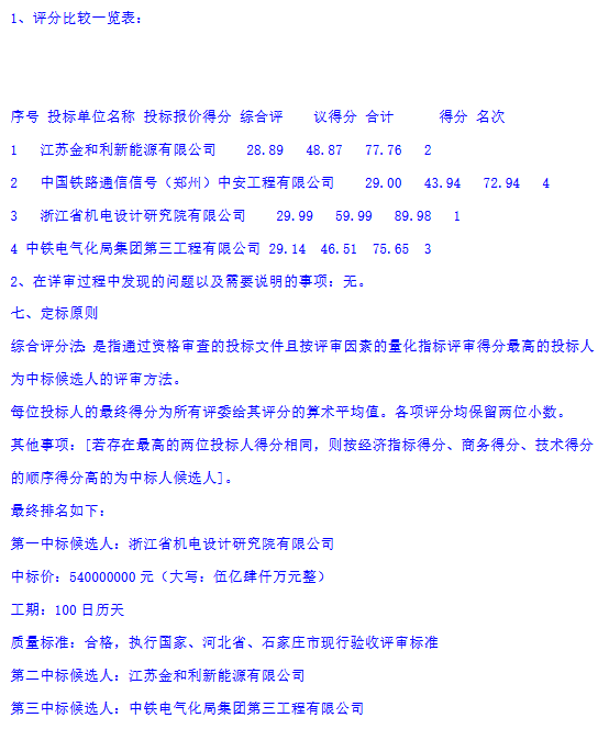 北极星储能网获悉,9月28日,辛集300MW/600MWh独立储能项目设计施工总承包候选人公示。中标候选人第一名为浙江省机电设计研究院有限公司,投标报价54000万元,折合单价0.9元/Wh。江苏金和利新能源有限公司、中铁电气化局集团第三工程有限公司分别为第二第三中标候选人,中国铁路通信信号(郑州)中安工程有限公司排名第四。