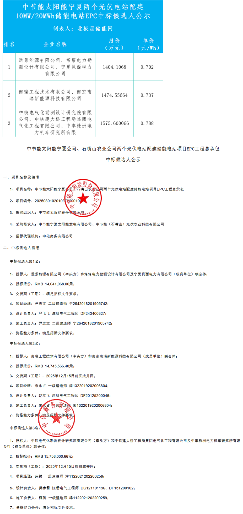 北极星储能网获悉,9月28日,中节能太阳能宁夏公司、石嘴山农业公司两个光伏电站配建储能电站项目EPC工程总承包中标候选人公示。本项目工程范围为完成2个光伏电站配套建设储能项目(配储总容量为直流侧10MW/20MWh)竣工验收所涉及到的所有勘察、设计、采购、安装和施工工作以及运维相关附属设施及工具采购。