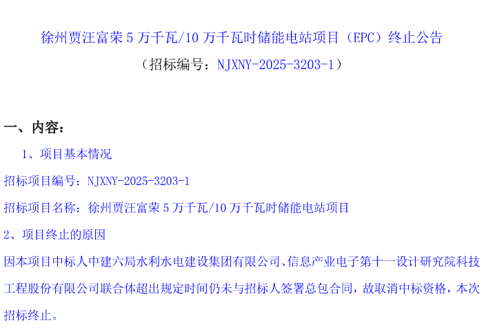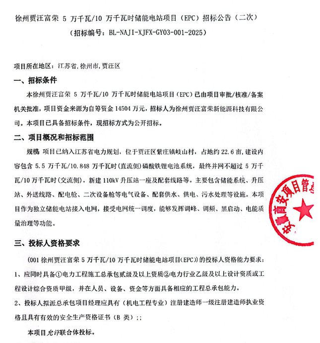 9月28日,徐州贾汪富荣新能源科技有限公司发布徐州贾汪富荣 5 万千瓦/10 万千瓦时储能电站项目(EPC)招标公告(二次)。在此前的一次招标中,本项目中标人中建六局水利水电建设集团有限公司、信息产业电子第十一设计研究院科技工程股份有限公司联合体超出规定时间仍未与招标人签署总包合同,故取消中标资格,一次招标终止。