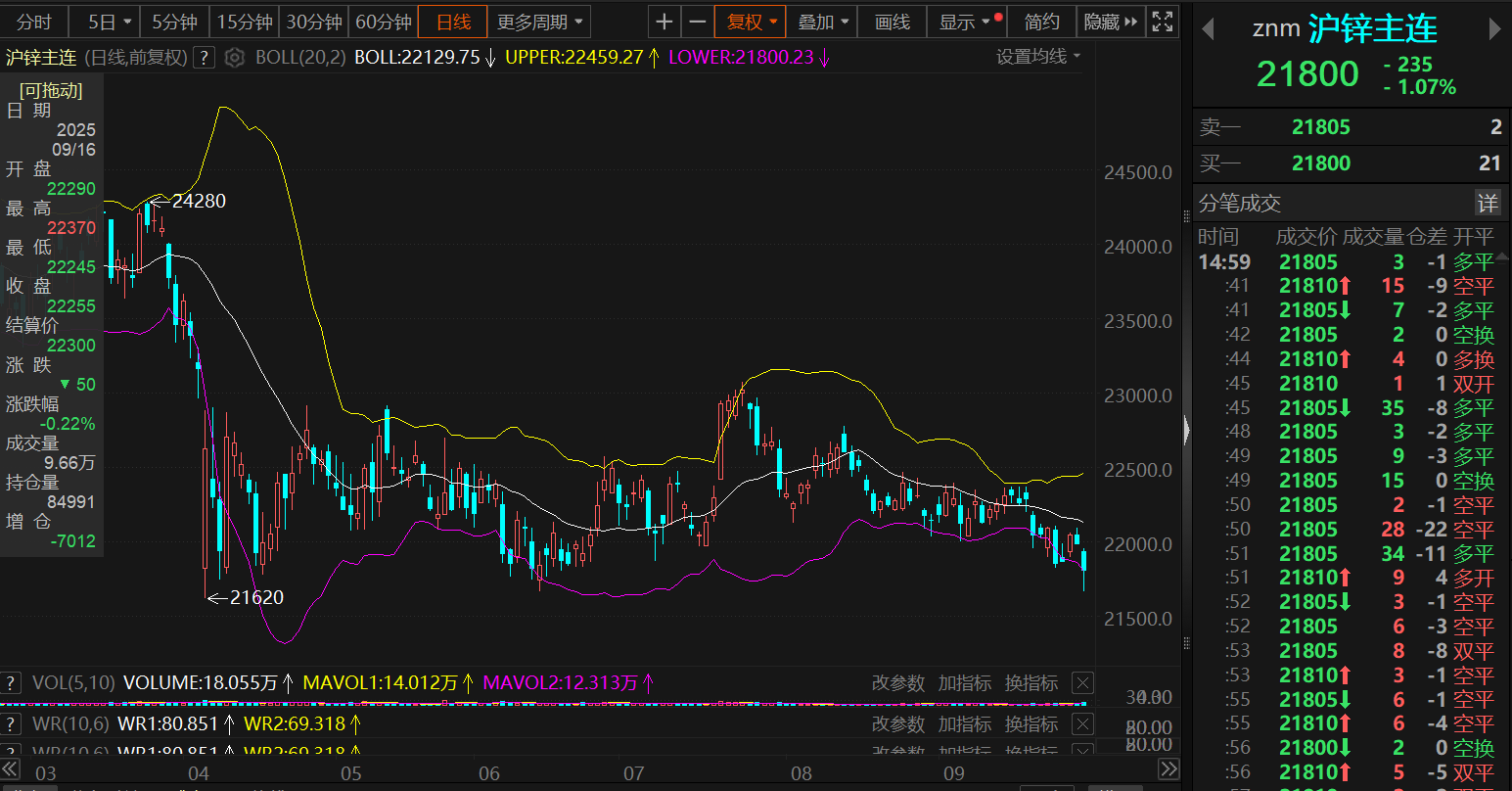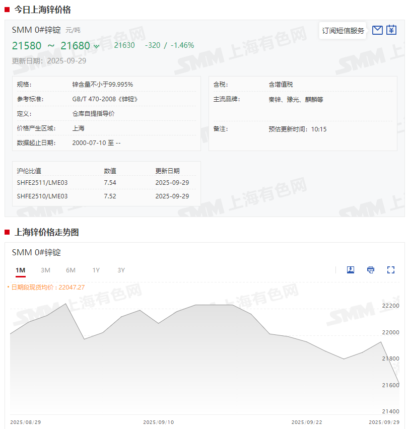 SMM 9月29日讯:9月26日晚间,沪锌主连夜盘持续回落,收盘跌超1%,9月29日日间,沪锌主连延续隔夜的跌势继续下挫,截至日间收盘,沪锌主连以1.07%的跌幅报21800元/吨。