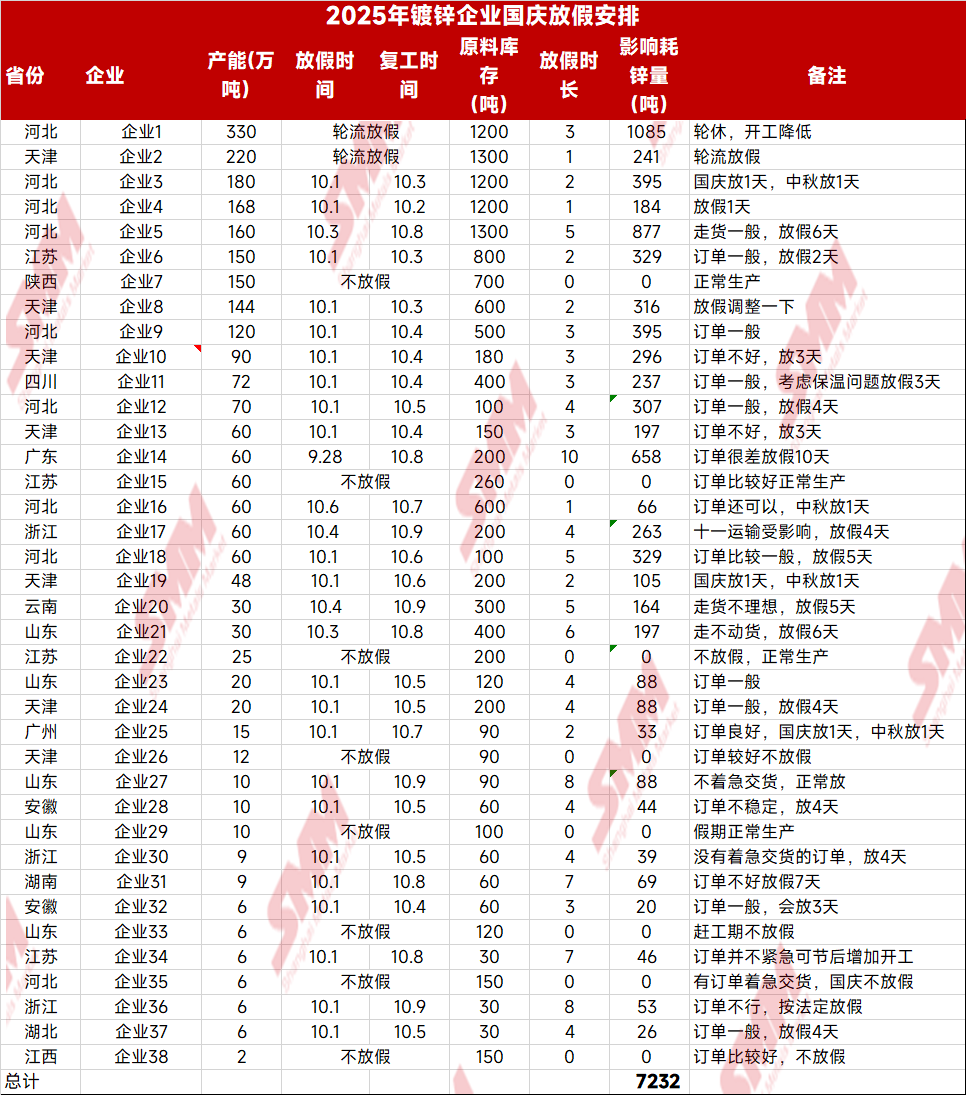 国庆及中秋双节假期已经步入倒计时,锌下游消费板块企业陆续进入放假流程,SMM近期整理了锌下游各板块的放假详情及相关影响,具体如下: