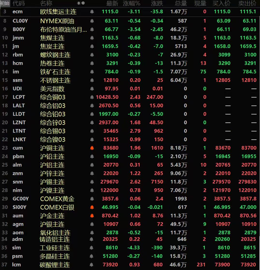 隔夜内外盘金属普涨,仅伦铅和沪铅一同下跌,伦铅跌0.27%,沪铅跌0.09%。伦铜、伦锡、沪锡一同涨逾2%,沪锡涨2.62%,伦锡涨2.79%,伦铜涨2.43%。伦锌涨1.68%,沪锌涨1.22%,其余金属涨幅均在1%以内。氧化铝主连跌0.52%,铸造铝主连涨0.22%。