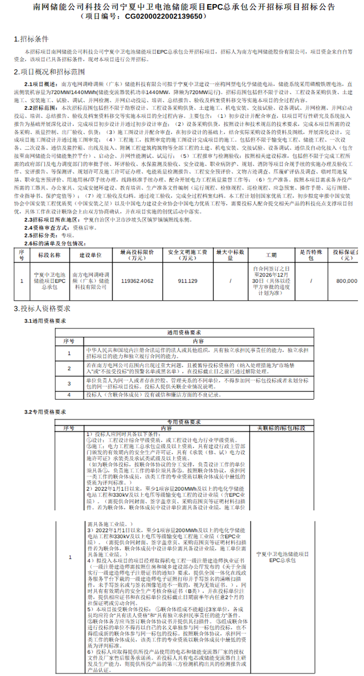 北极星储能网讯:9月29日,南方电网储能股份有限公司发布宁夏中卫电池储能项目EPC招标公告,项目资金来自自筹资金,最高投标限价119362.4062万元,约合0.8289元/Wh,项目位于宁夏中卫沙坡头。