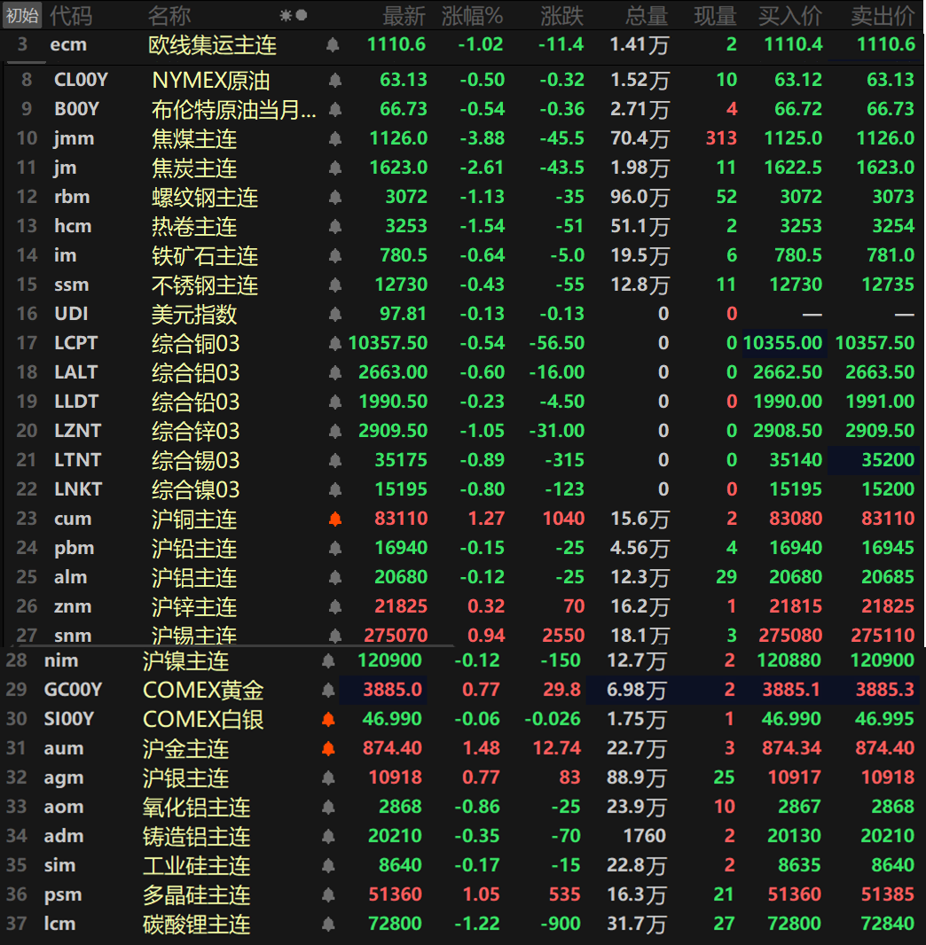 此外,碳酸锂主连跌1.22%,工业硅主连跌0.17%,多晶硅主连涨1.05%,欧线集运主连跌1.02%报1110.6。