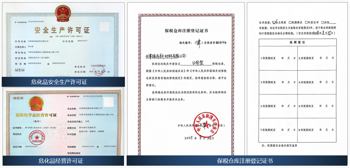 绿伟新材料拥有带存储设施的危险化学品经营许可证、危险化学品安全生产许可证及公用型保税仓库资质等齐全的特许经营资质,配备了CNAS认证标准实验室,已通过了质量管理体系、环境管理体系、职业健康安全管理体系认证。