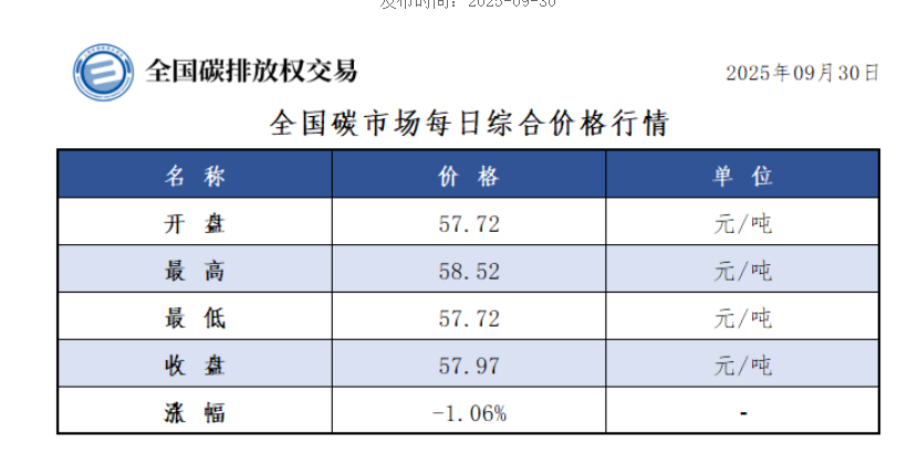 今日全国碳市场综合价格行情为: 开盘价57.72元/吨,最高价58.52元/吨,最低价57.72元/吨,收盘价57.97元/吨,收盘价较前一日下跌1.06%。