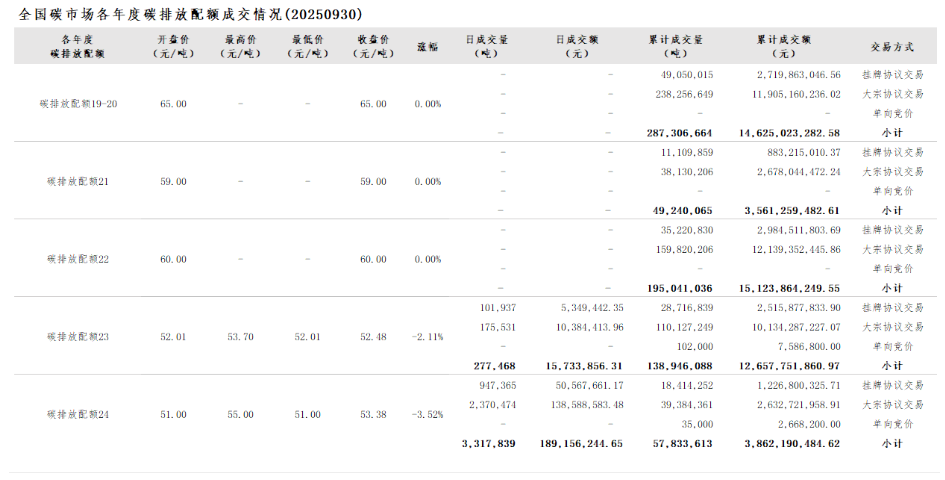 截至2025年9月30日,全国碳市场碳排放配额累计成交量728,367,466吨,累计成交额49,830,089,360.33元。