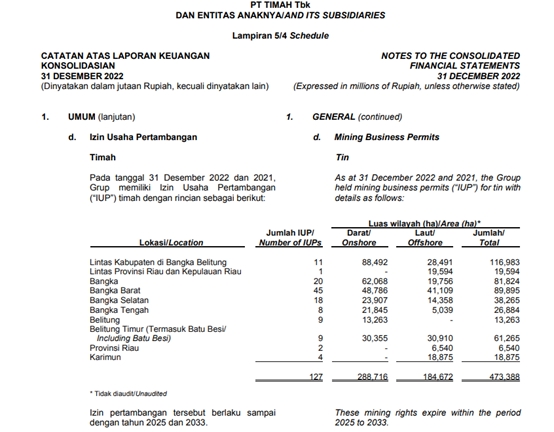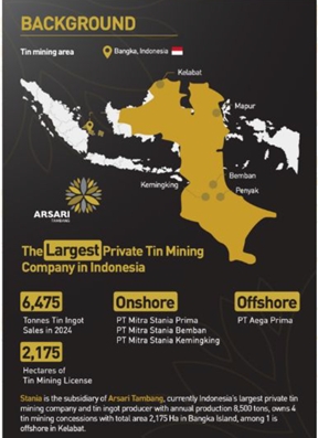 Arsari Tambang 旗下子公司 Stania 持有 4 个锡矿开采特许权,总矿区面积 2175 公顷(1 个海上矿区、3 个陆上矿区),年锡产量达 8500 吨。
