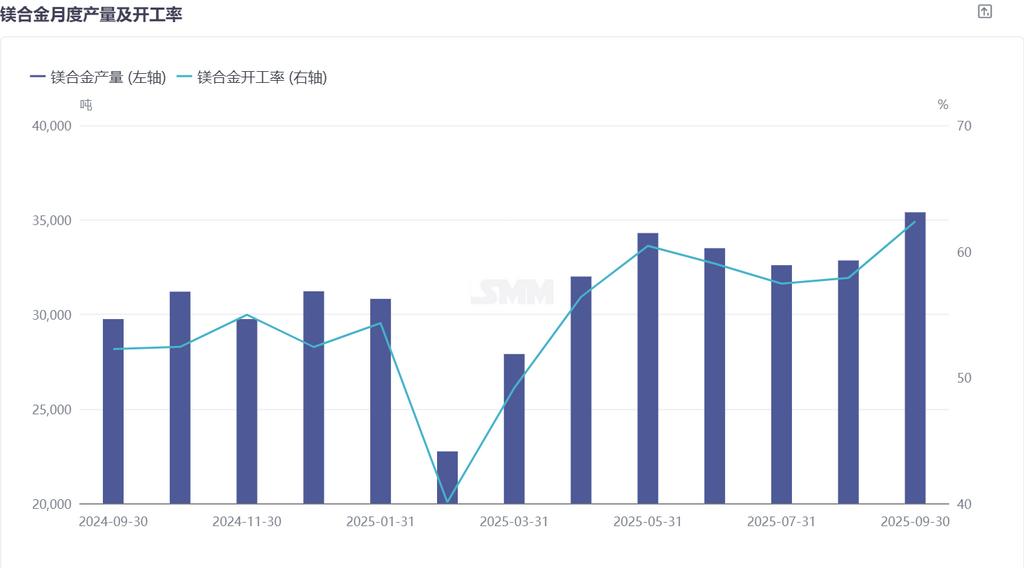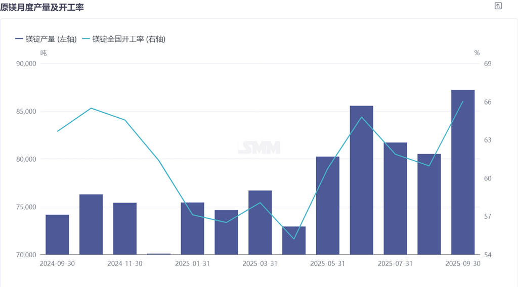 根据SMM数据显示,2025年9月中国原镁产量环比增长8.33%,开工率上调至66.03%。