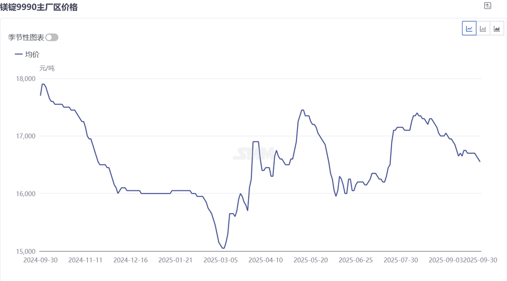 九月镁价在16500-17000元/吨的价格区间运行,整体市场呈现震荡下行走势,九月的月均价由八月的17226下行至16784,环比下跌2.56%。