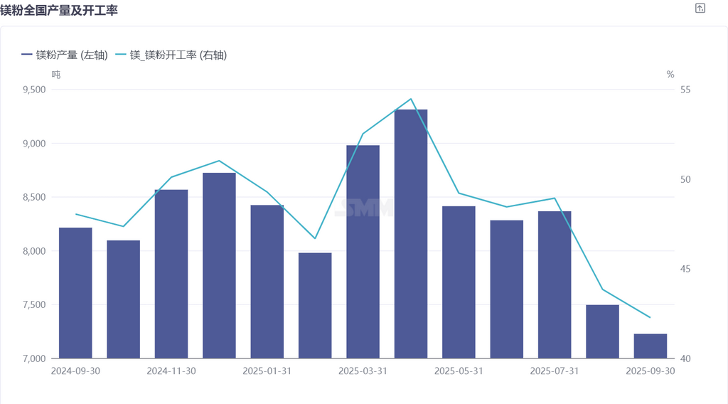 根据SMM数据显示,2025年9月中国镁粉产量环比下调3.60%,开工率下调至42.25%。