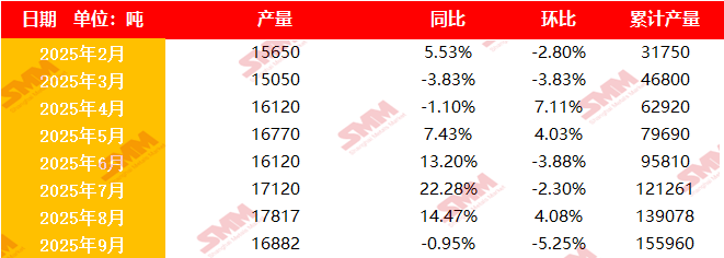 据SMM统计:2025年9月国内钼铁产量约为16882吨,同比减少0.95%,环比8月减少5.25%。