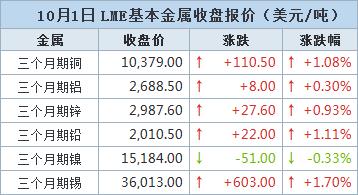 伦敦时间10月1日17:00(北京时间10月2日00:00),LME三个月期铜下跌145.5美元,或1.4%,收报每吨10,268.5美元。稍早高见10,399美元,接近9月25日触及的15个月高位10,485美元。