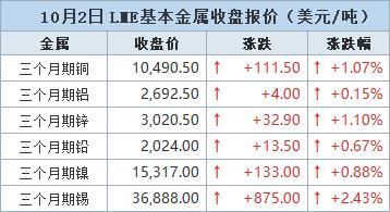 伦敦时间10月2日17:00(北京时间10月3日00:00),LME三个月期铜上涨111.5美元,或1.07%,收报每吨10,490.5美元,盘中触及10,531美元的去年5月以来最高价位。