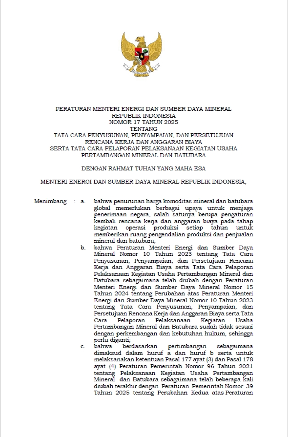 2025年10月3日,印度尼西亚能源与矿产资源部正式公布《2025年第17号部长条例》,即《关于2026年矿产与煤炭采矿活动的工作计划与预算编制、提交、批准及执行报告的程序》。该条例将原先三年期的RKAB审批制度调整回年度制,自2026年起重新实施。尽管部分矿业许可证(IUP)已在2024年和2025年获得2026年的生产配额,但这些配额现被宣布作废。该法规的关键变化在于RKAB 周期由原来的三年制重新调整为一年制(自 2026 年起生效)。虽然部分企业在 2024–2025 年间已获得 2026 年的采矿配额,但这些配额将被全部作废,企业需重新提交新的年度 RKAB。